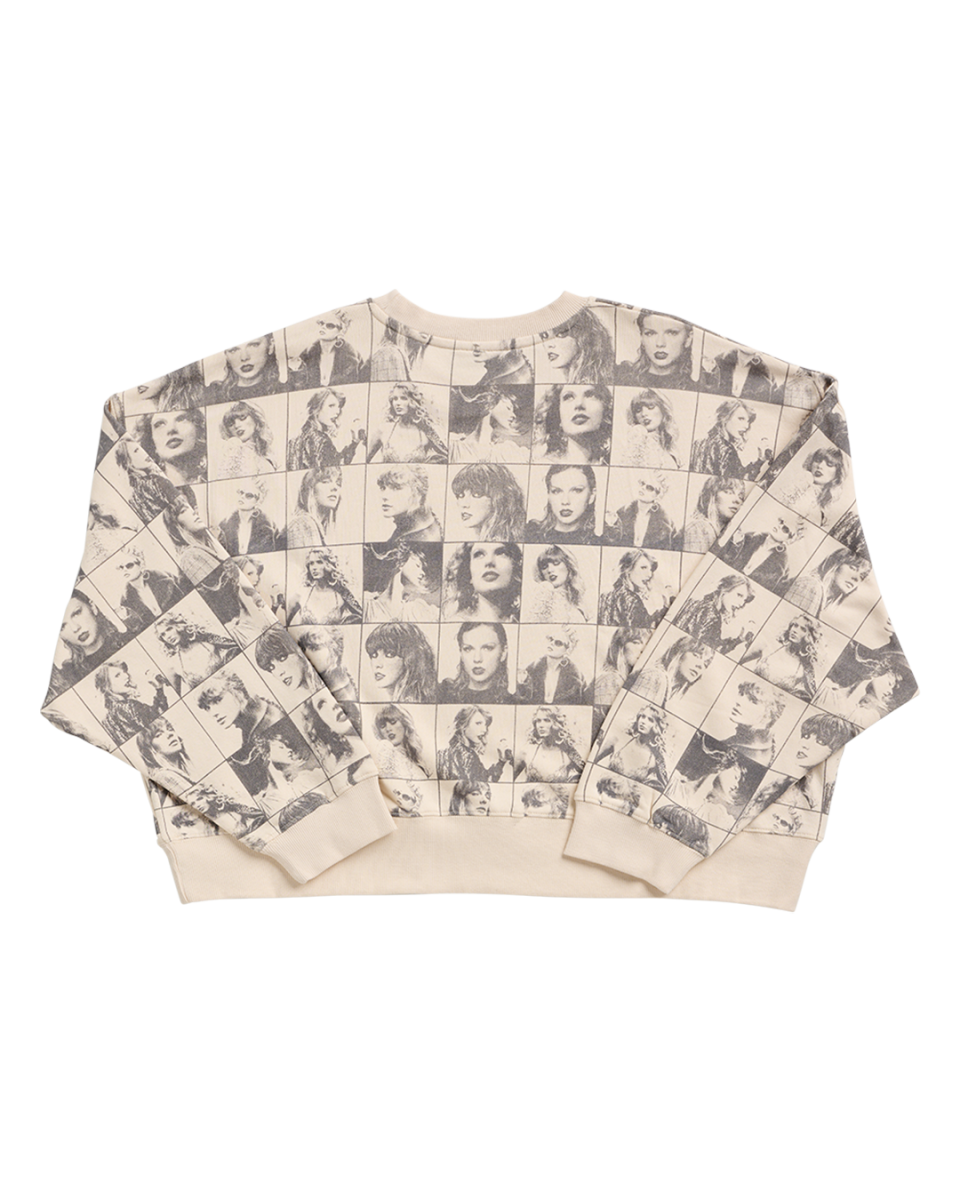 Black crewneck featuring photo of Taylor Swift printed on front.