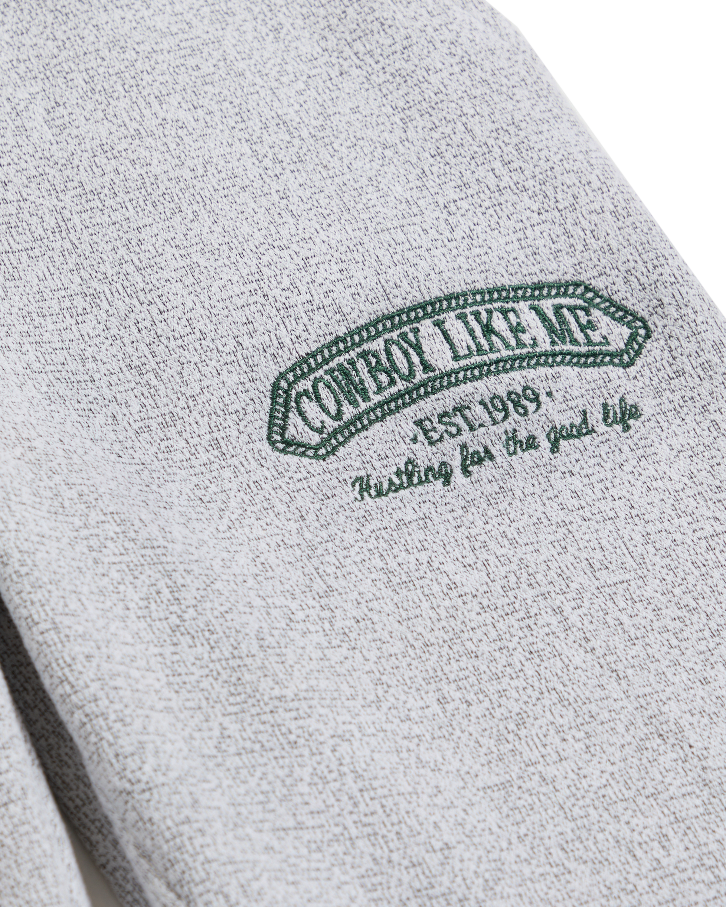 Gray plush textured knit joggers with elastic waist and side pockets featuring Cowboy Like Me song title and Est. 1989 with Hustling for the good life song lyrics embroidered on wearer’s front left leg.