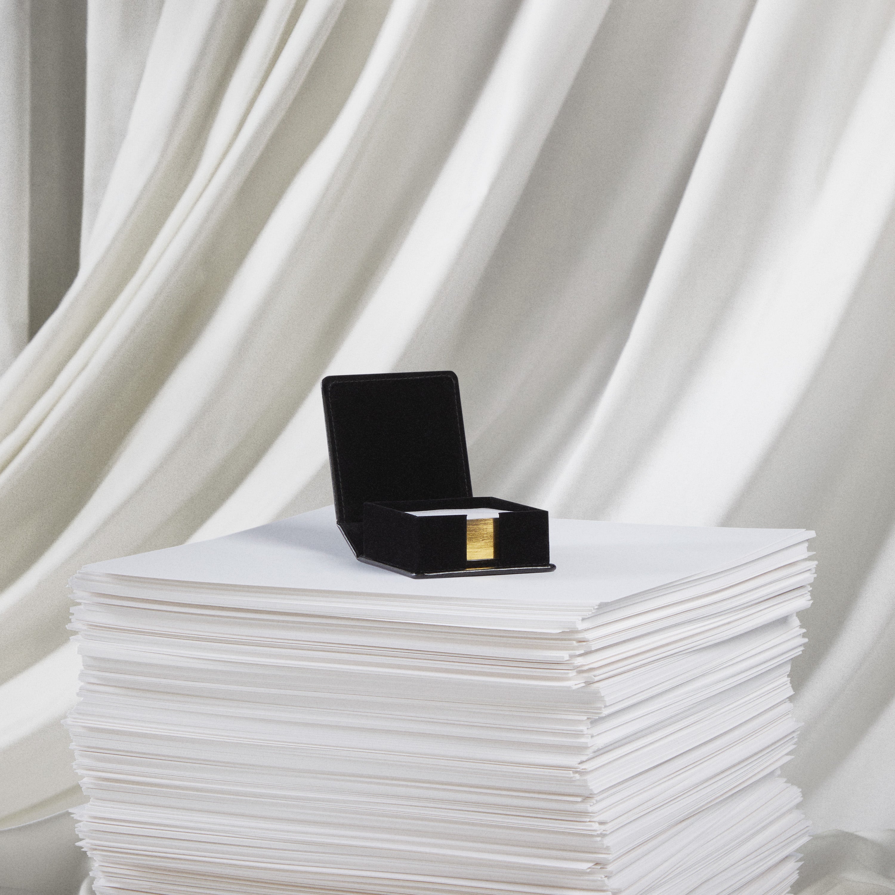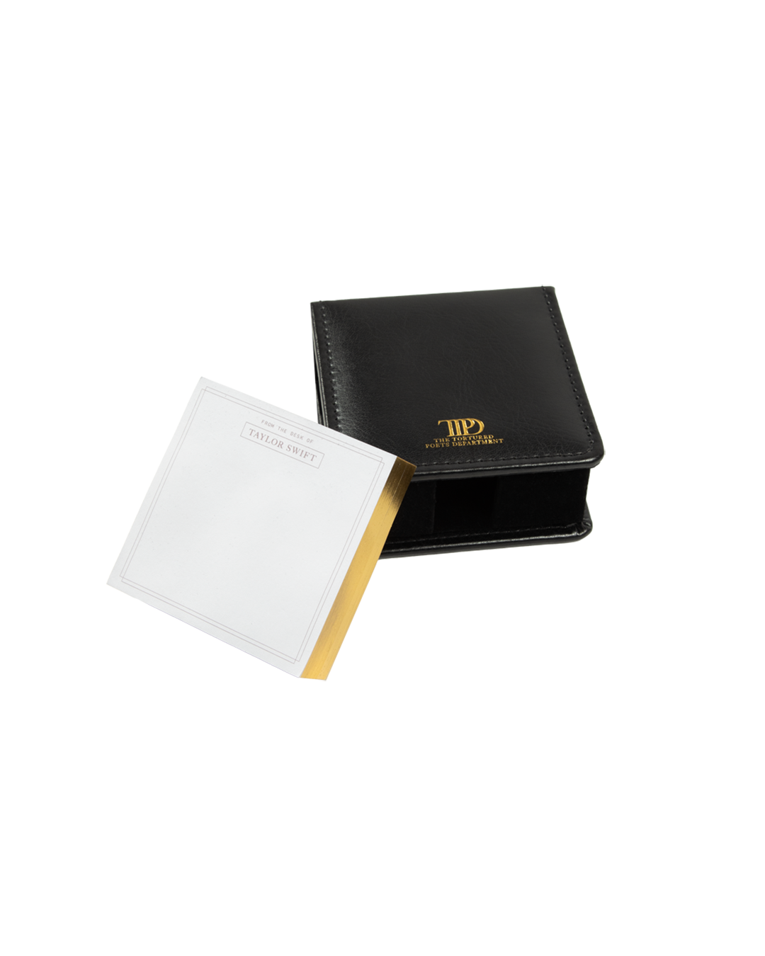 Cream sticky notepad featuring double line design and From The Desk Of and Taylor Swift with box design printed at top of each notepad page and black leather notepad holder with TTPD album logo and The Tortured Poets Department printed on front in gold foil and Taylor Swift with box design printed on back in gold foil.