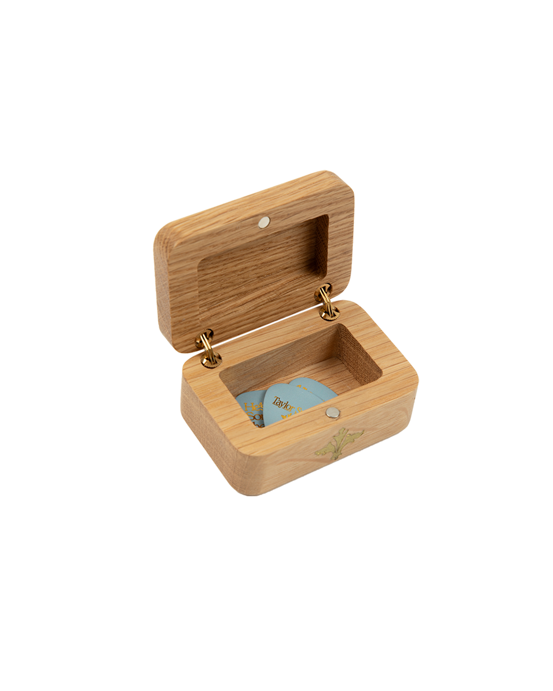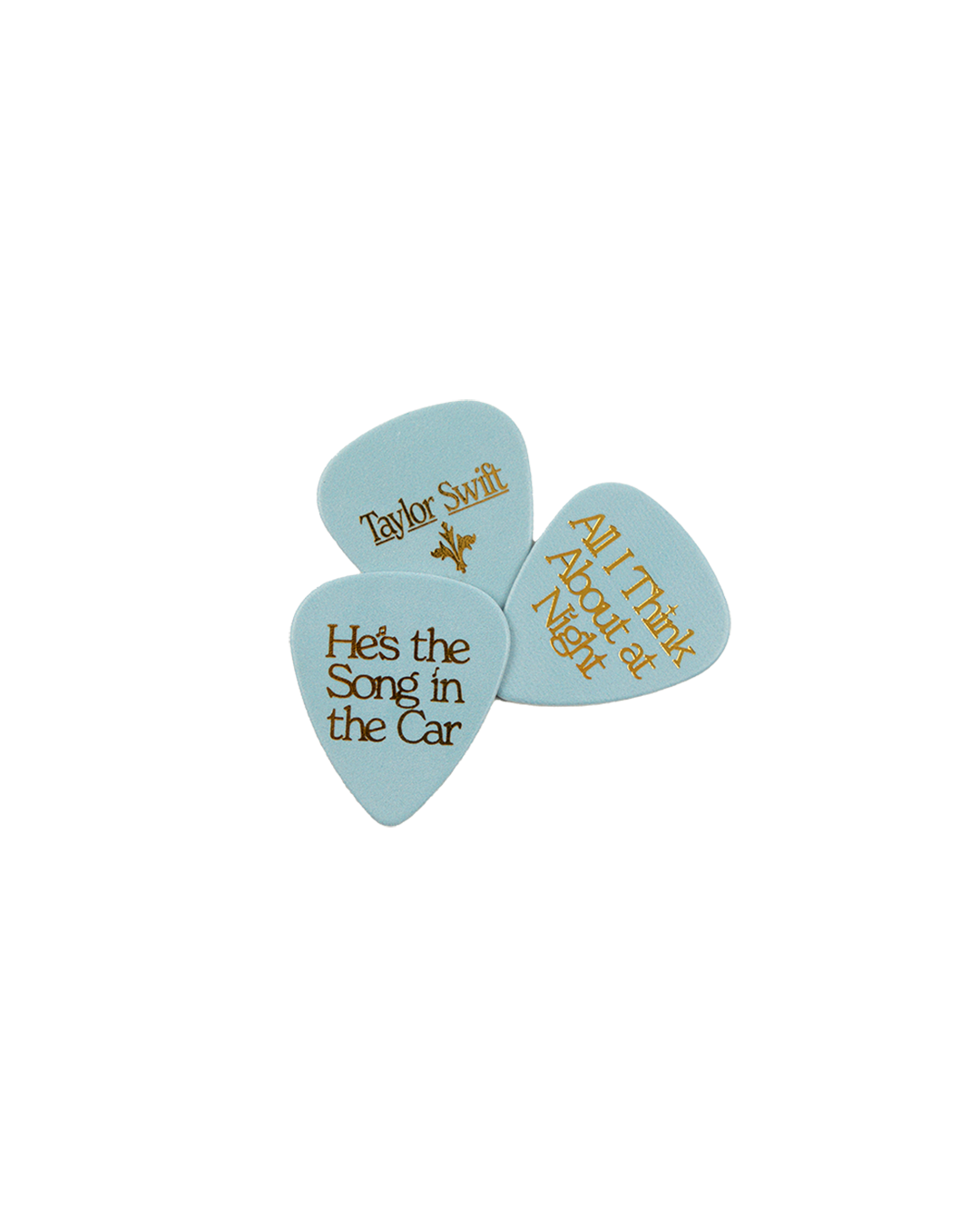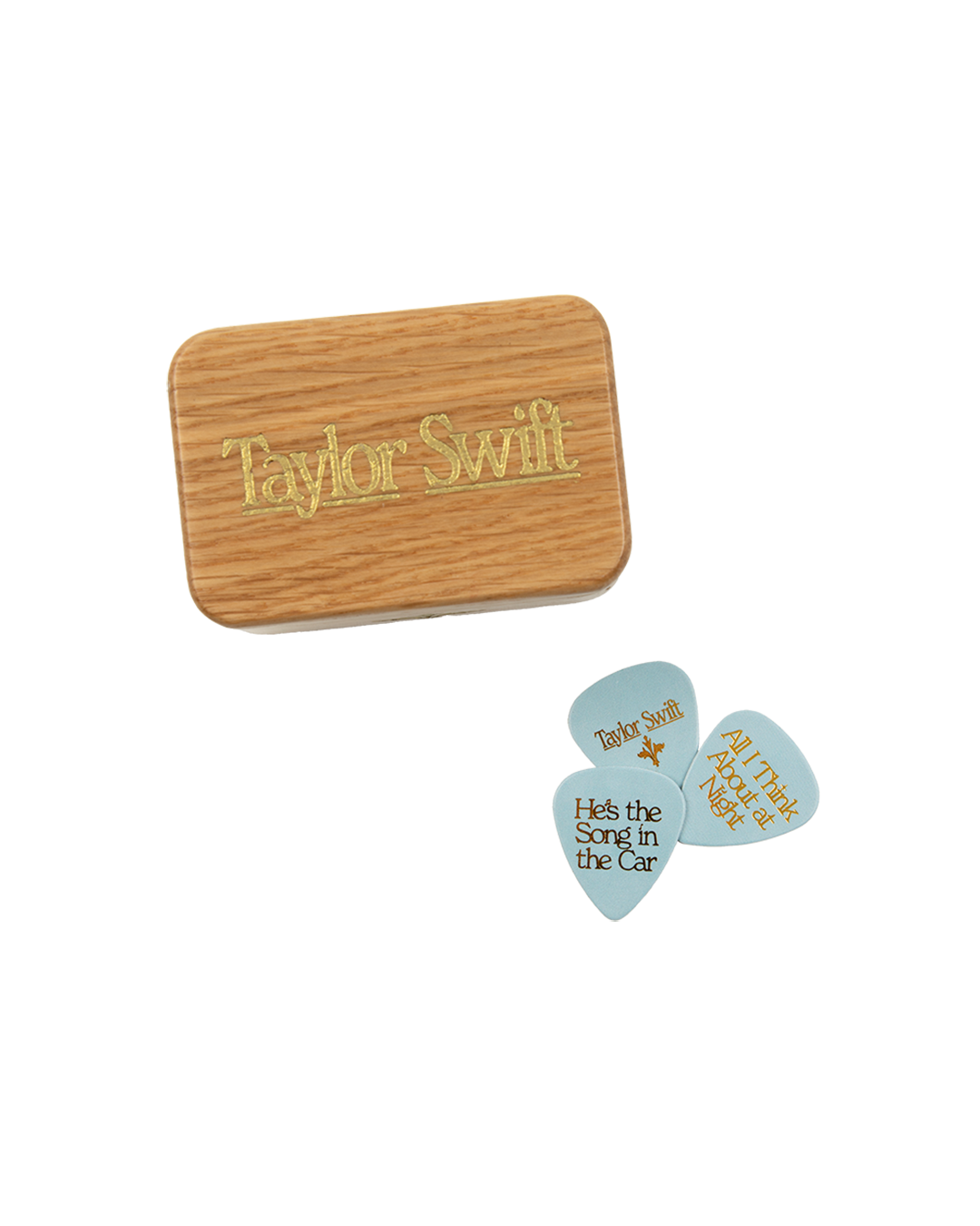 A set of three light blue guitar picks featuring the words Fake a Smile. All I Think About at Night. and He’s the Song in the Car printed on front with gold foil fluer-de-lis design and Taylor Swift printed on back. Includes wooden box featuring Taylor Swift engraved on top.