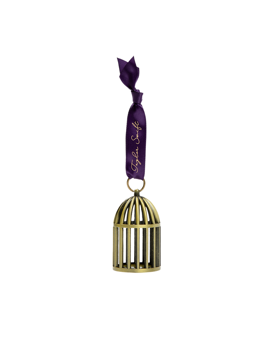 Bronze birdcage ornament featuring the words Speak Now imprinted on bottom with Taylor Swift printed on ribbon.