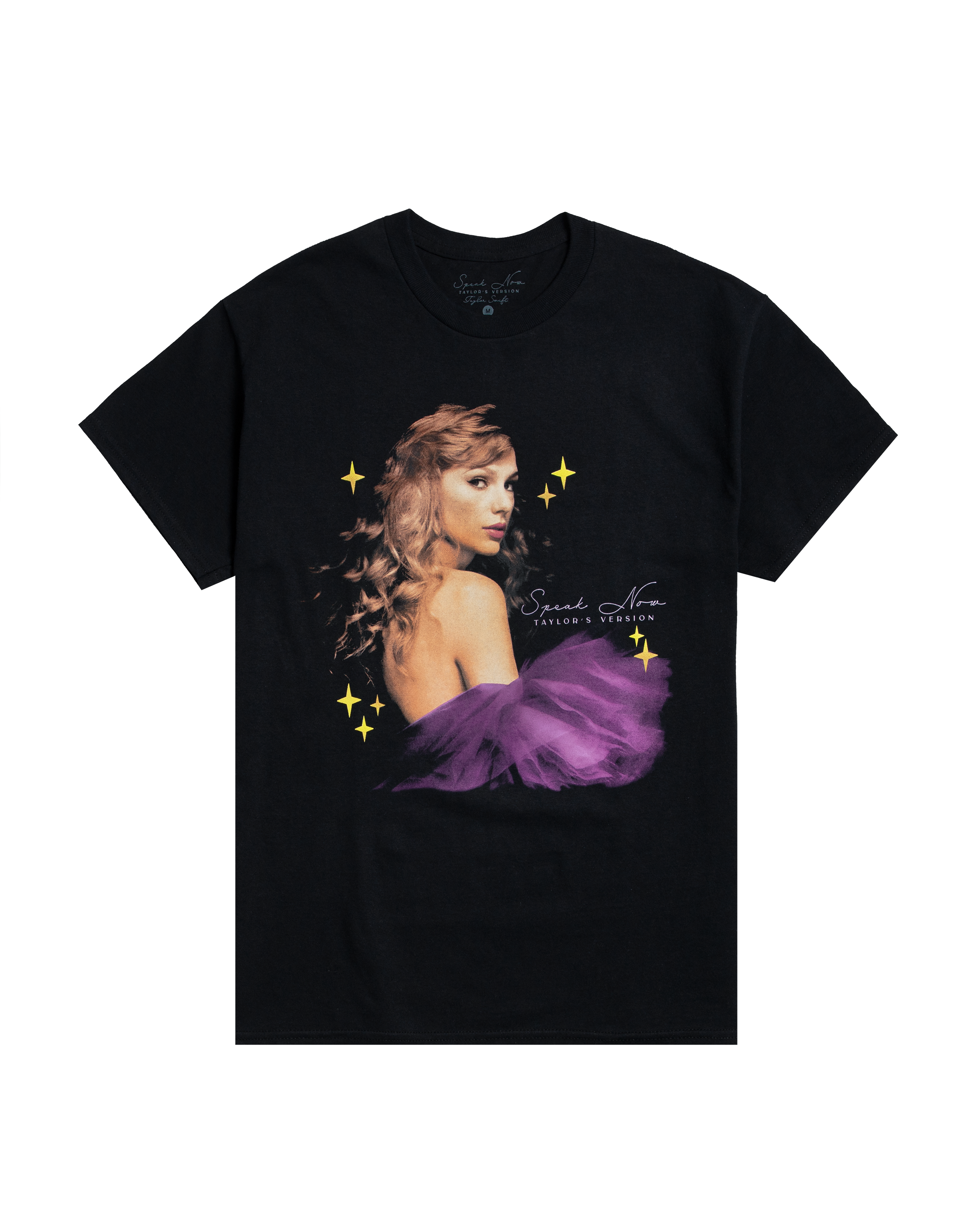 Black t-shirt featuring  Speak Now (Taylor’s Version) album cover photo. spark design. and Speak Now Taylor’s Version printed on front.
