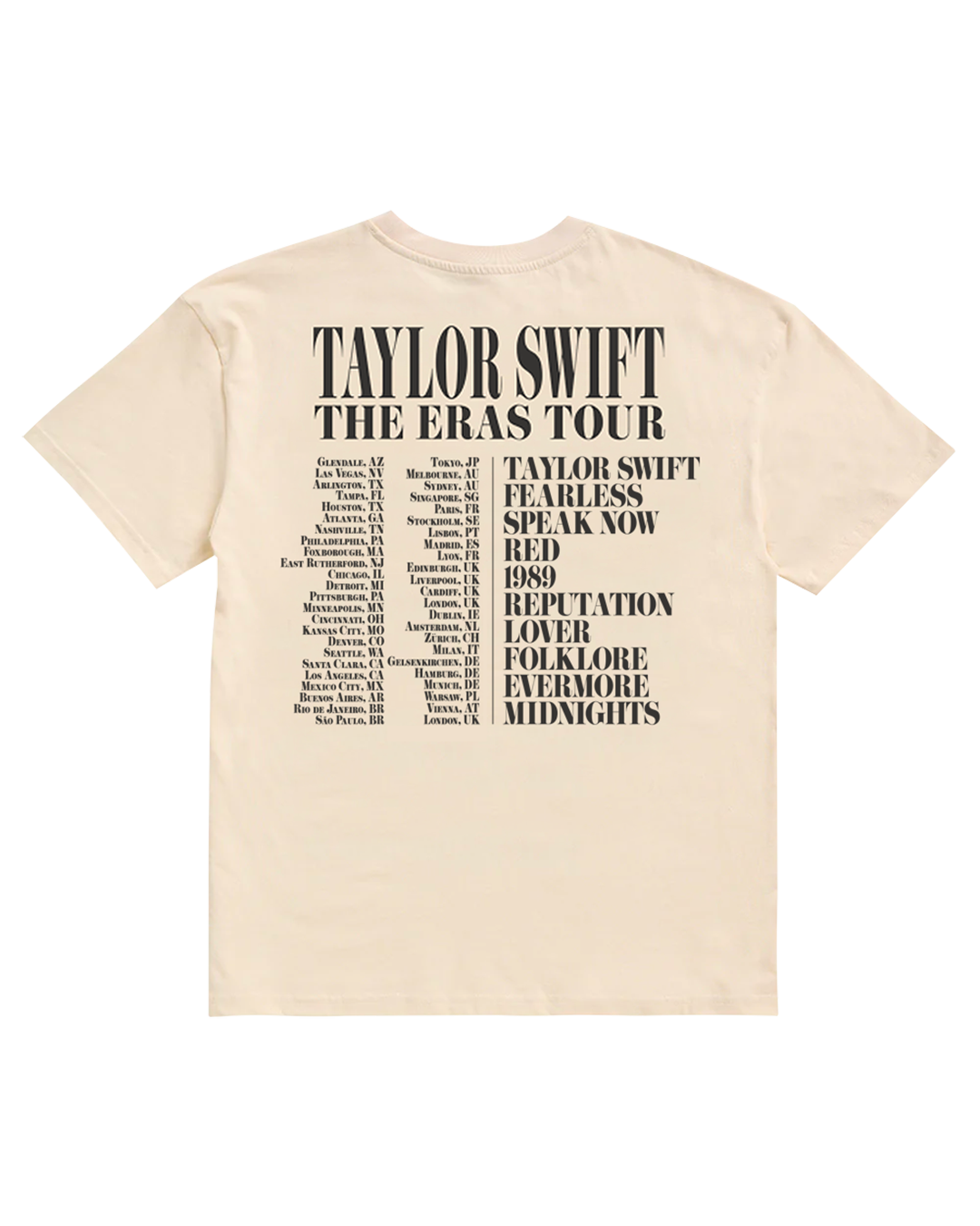 Beige t-shirt featuring Taylor Swift | The Eras Tour and photos printed on front with Taylor Swift | The Eras Tour. U.S. and international tour locations. and Taylor Swift album titles printed on back.
