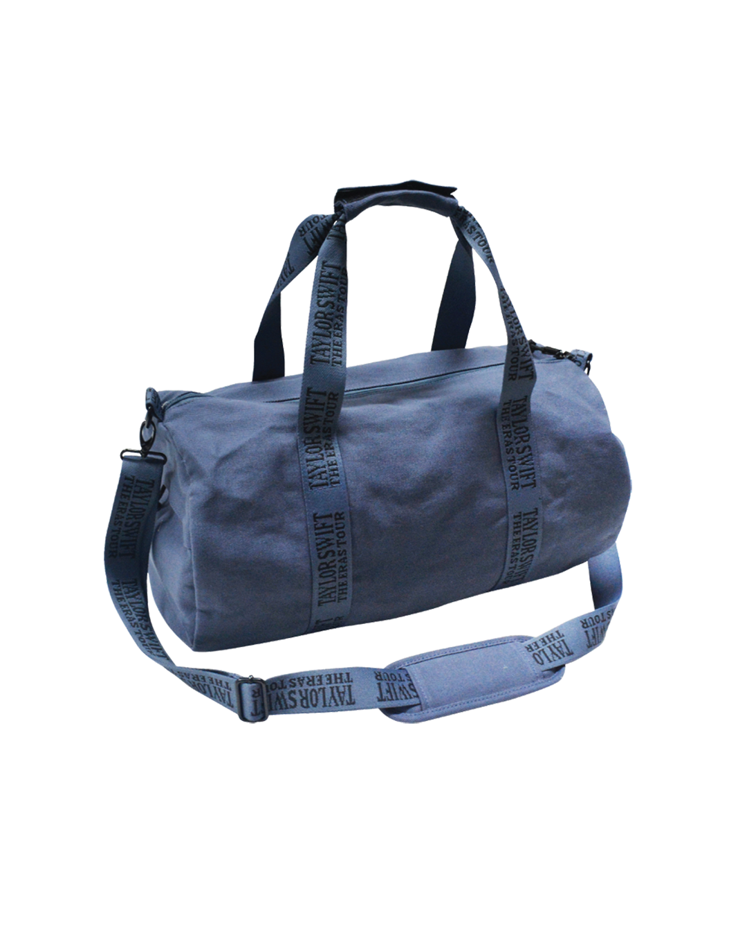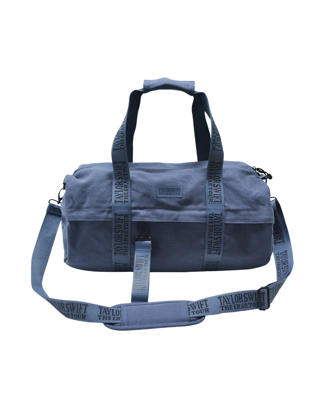 Blue duffle bag featuring Taylor Swift The Eras Tour logo woven into handles and adjustable shoulder strap. Bag comes with detachable zipper pull keychain.