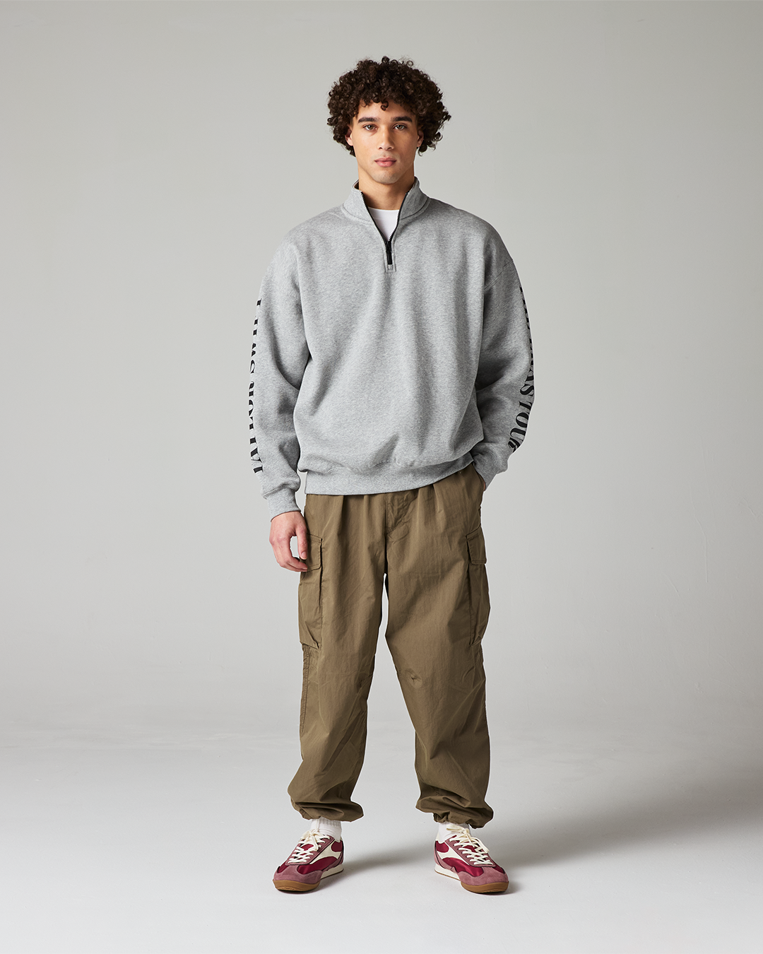 Gray quarter zip sweatshirt featuring Taylor Swift printed on wearer’s right sleeve and The Eras Tour printed on wearer’s left sleeve with photos of Taylor Swift printed on back.