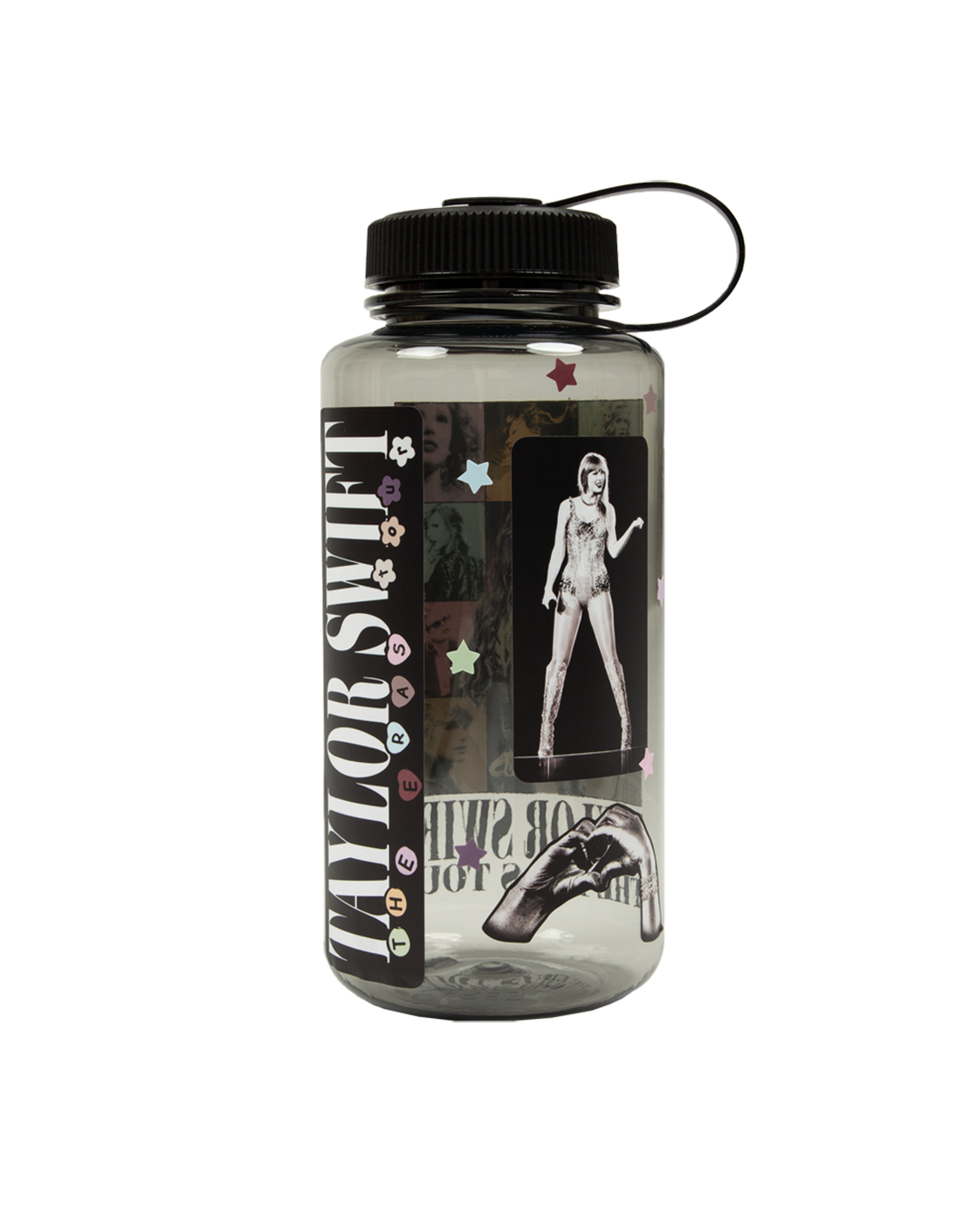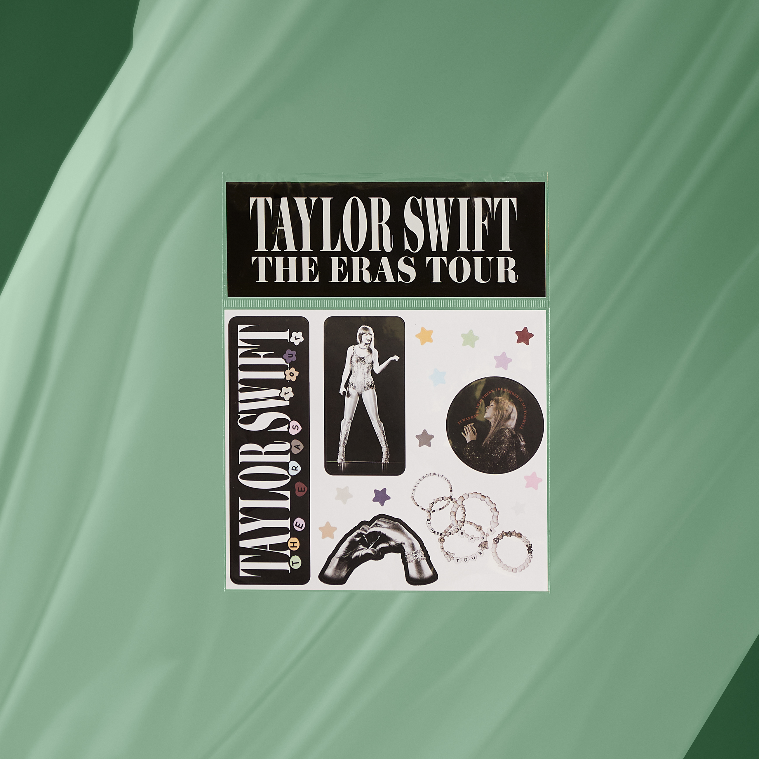 Set of 15 stickers with Taylor Swift The Eras Tour. heart hands. photos of Taylor Swift. and friendship bracelet and star designs printed on front. PLEASE NOTE. sticker pack photographed with Taylor Swift | The Eras Tour Water Bottle for display purposes only. Water bottle not included with a purchase of this item.