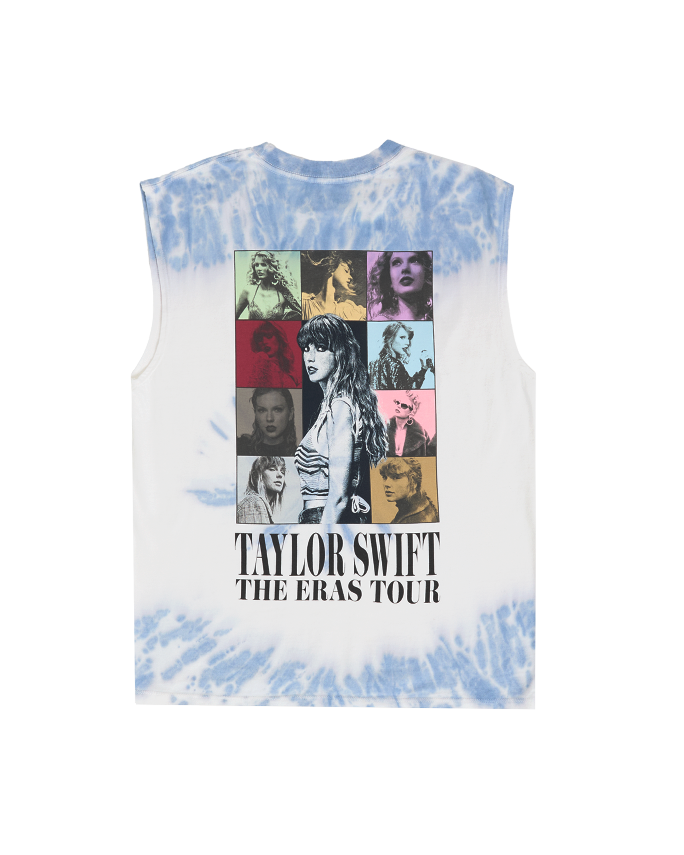 Blue swirl tie dye tank top featuring Taylor Swift | The Eras Tour printed on front with photos of Taylor Swift and Taylor Swift | The Eras Tour printed on back.