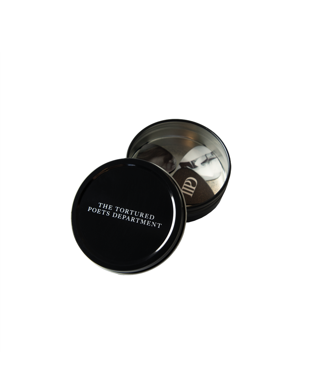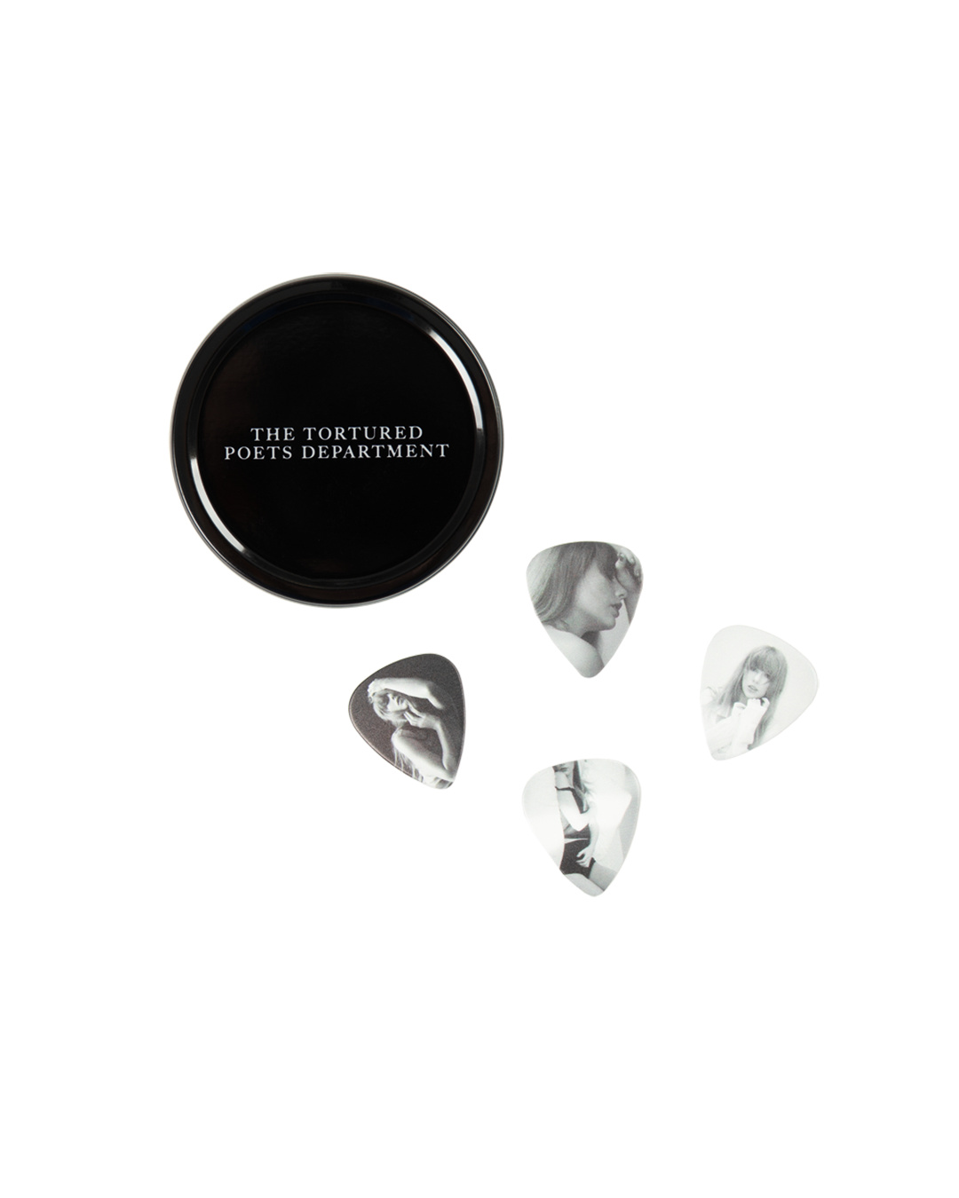 Set of 4 guitar picks featuring photos of Taylor Swift on one side and TTPD album logo on other side. Includes black tin holder with The Tortured Poets Department printed on top and Taylor Swift printed on bottom with box design.